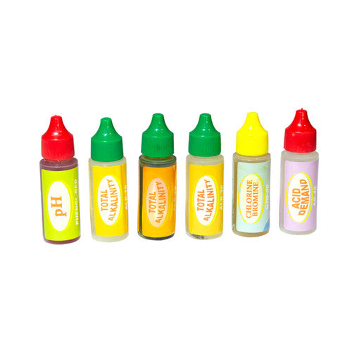 • 5 Line Set: Sets of 5 solution for measuring ph, chlorine, bromine, acid requirement and total alkalinity values.